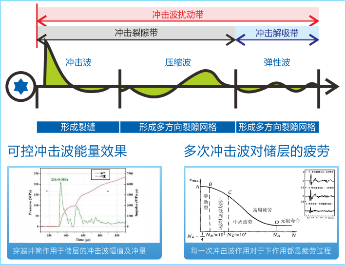 重复可控冲击波有别于传统增产技术,它以电能为基础,通过储能装置储存能量,经过功率源压缩放大后以强脉冲形式瞬间释放,产生快前沿的高强度冲击波。该技术可精准控制作业位置和作业强度,在保证井筒安全的前提下,可多次多点重复作业,实现高渗储层解堵,中、低渗储层增透,是一种物理法解堵增产新技术。